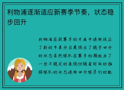 利物浦在新赛季的开局中,逐渐适应了新的节奏,并且展现出了稳步回升的状态。虽然球队在赛季初期经历了一些不稳定的表现,但随着时间的推移,球队的状态逐渐回升,球员们的配合更加默契,进攻和防守也逐步走上正轨。本文将从四个方面详细分析利物浦逐渐适应新赛季节奏,并稳步回升的表现,包括战术调整、球员状态提升、球队化学反应和主教练的策略引领。通过这些方面的探讨,我们可以清晰地看到利物浦在新赛季的进步轨迹,并预测球队未来可能的表现。最终,文章将总结利物浦的整体状态,并对球队的未来走向进行展望。